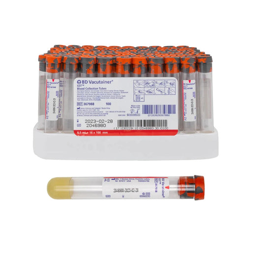 BD Vacutainer SST Tubes contain spray-coated silica to aid in clotting and a polymer gel for serum separation. Samples processed in these tubes are used for serum determinations in chemistry, blood donor screening, and infectious disease testing. BD Vacutainer SST Tubes provide an efficient means of serum sample preparation and help to improve laboratory workflow.