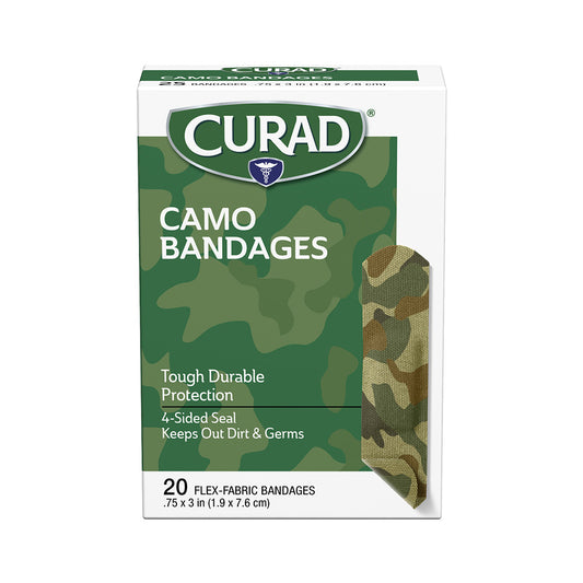 Camp CAMO bandages offer tough, durable protection with a signature camouflage design. CAMO bandages are designed with Flex-Fabric™ so they can stretch, bend, and breathe. Each bandage has a four-sided seal to protect the wound from dirt and germs, which helps prevents infection.
