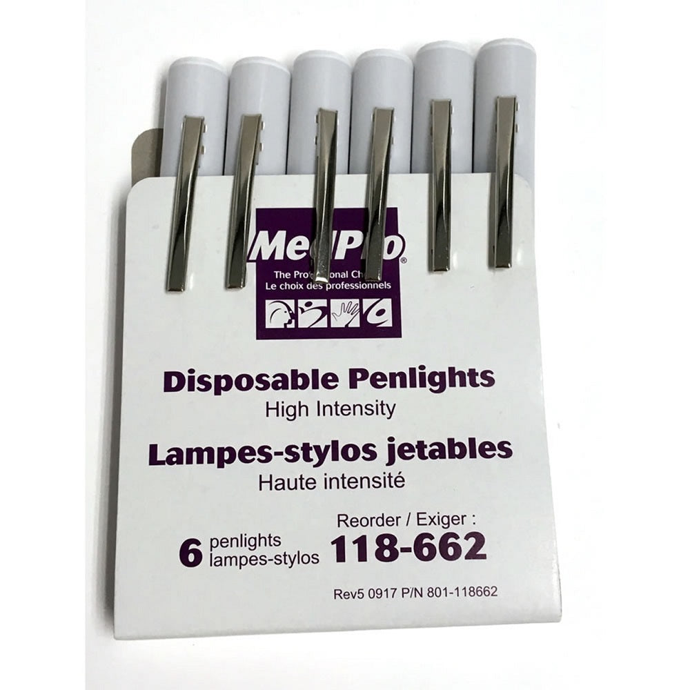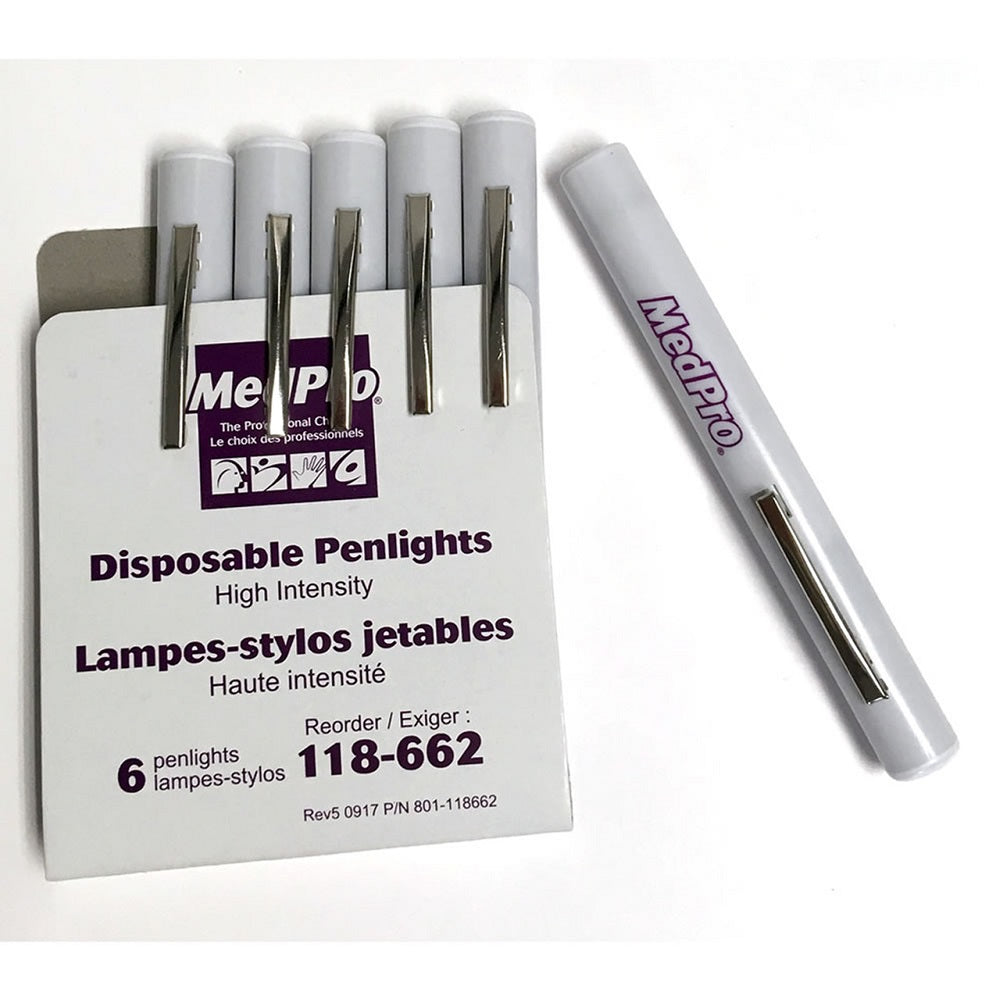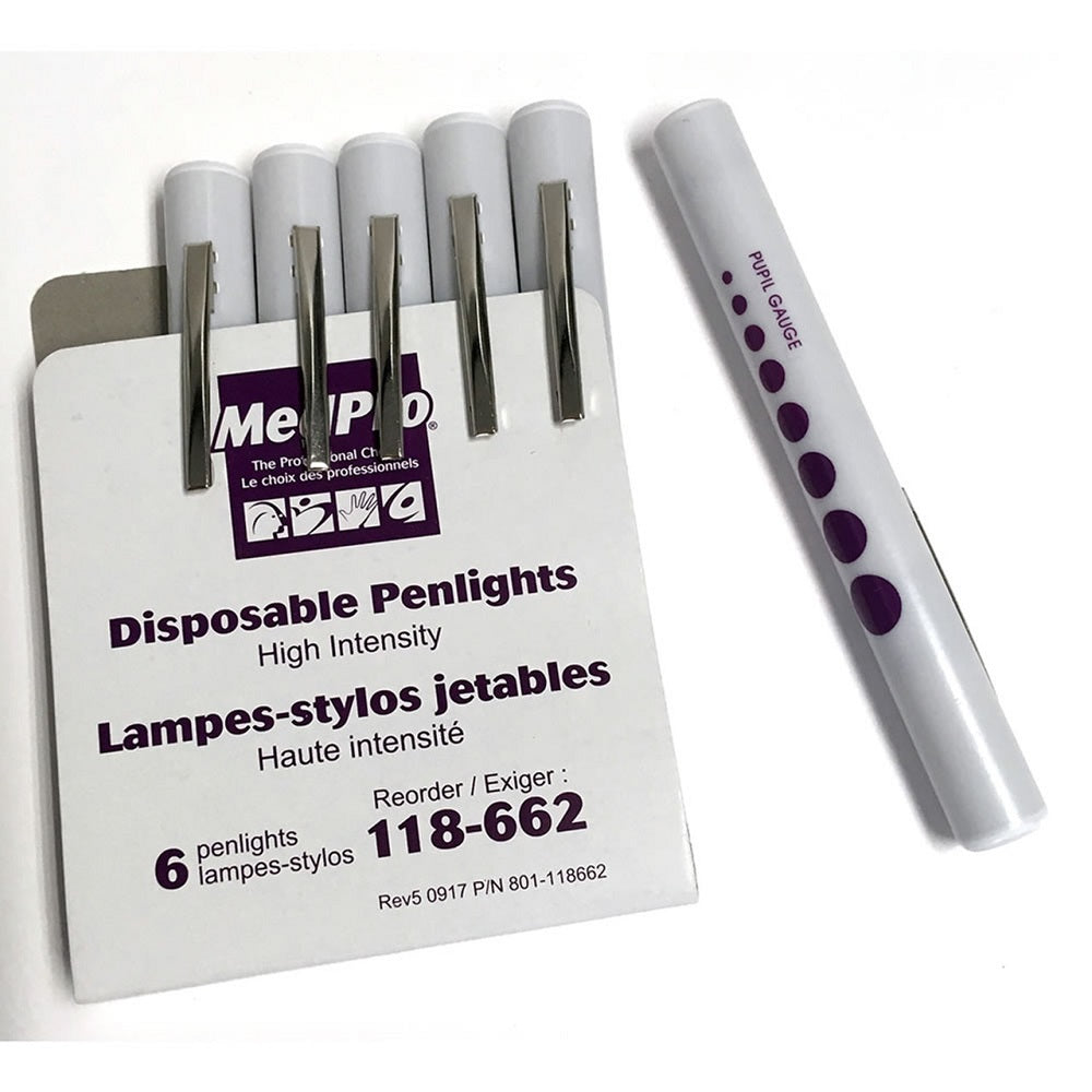 This disposable penlight features a high intensity focused beam operated by applying pressure to the metal pocket clip.