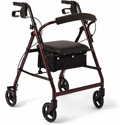 This lightweight rolling walker features a padded seat, curved backrest, and loop brakes for safe, easy mobility. It folds for storage and adjusts to user height. Includes a standard basket for convenience. Durable with a 250 lb capacity and limited lifetime warranty on the frame.