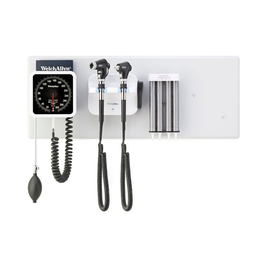 The Welch Allyn Green Series 777 Integrated Wall System offers a comprehensive solution for medical diagnostic tools, allowing for easy access to patient intake and vital signs. The system includes an ophthalmoscope and otoscope wall unit, a medical wall thermometer, and exam tools for capturing blood pressure, temperature, and SpO2. The system also offers the Welch Allyn PanOptic Plus Ophthalmoscope and Welch Allyn MacroView Plus Otoscope, providing larger, brighter views. This system streamlines workflow, standardizes patient data collection, and is energy-efficient.